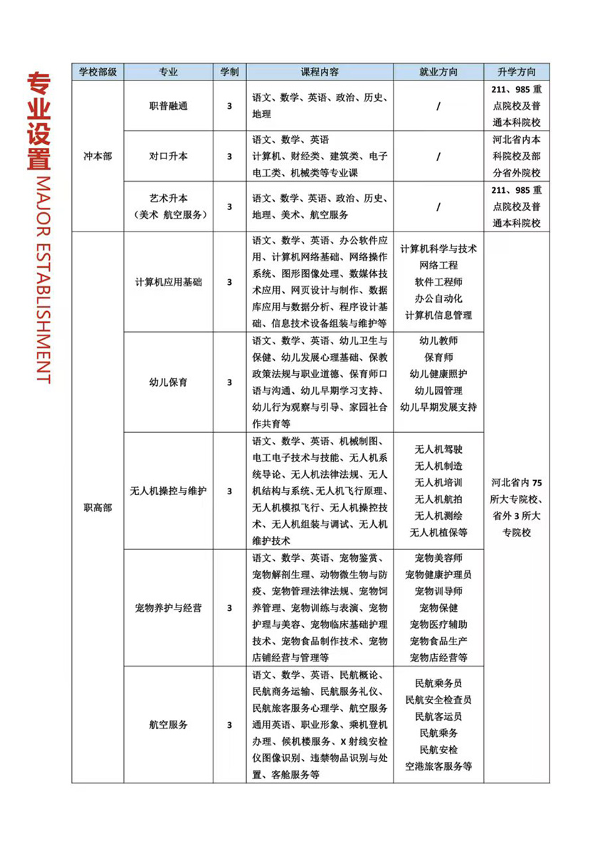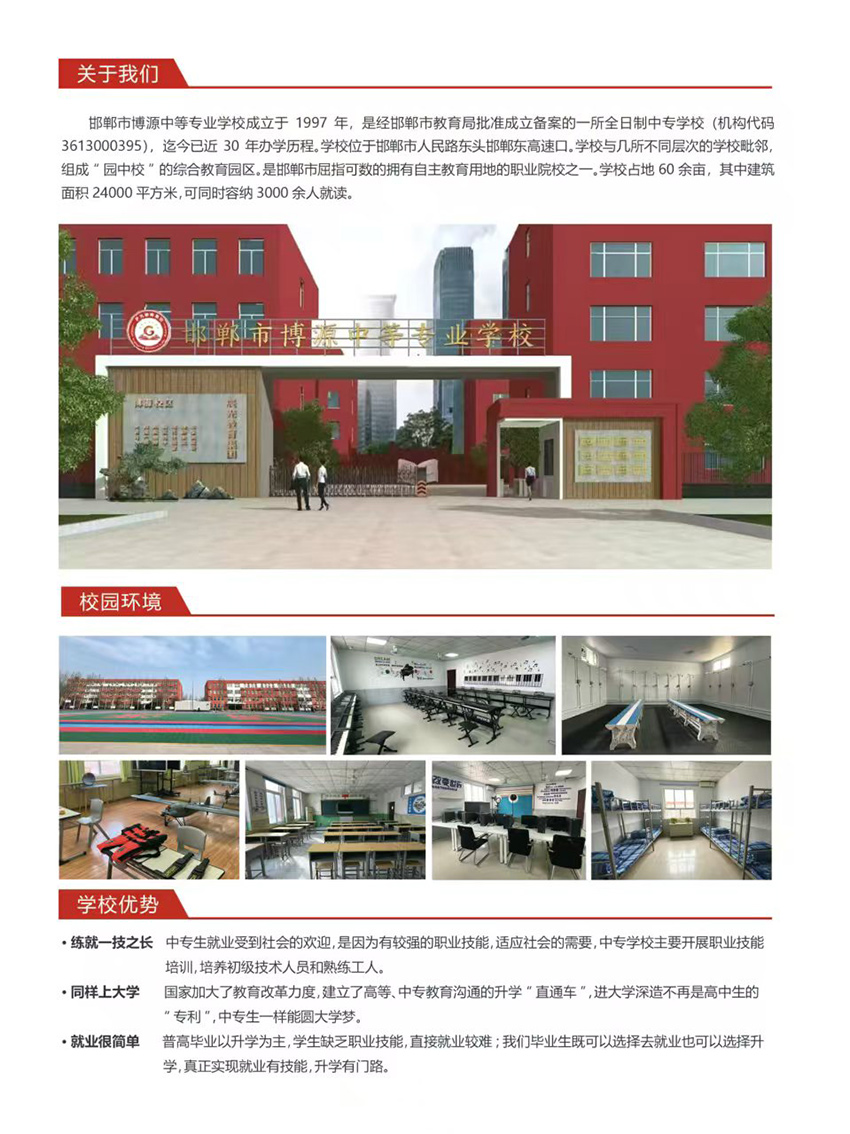 辰光教育集团·邯郸博源中专校区招生火热报名中 一、招生专业 计算机专业 幼儿保育专业 宠物专业 航空服务专业 无人机专业 二、升学及班级类型 职普融通班、对口升本班、单招升学班、艺术升本班、专业升学就业班