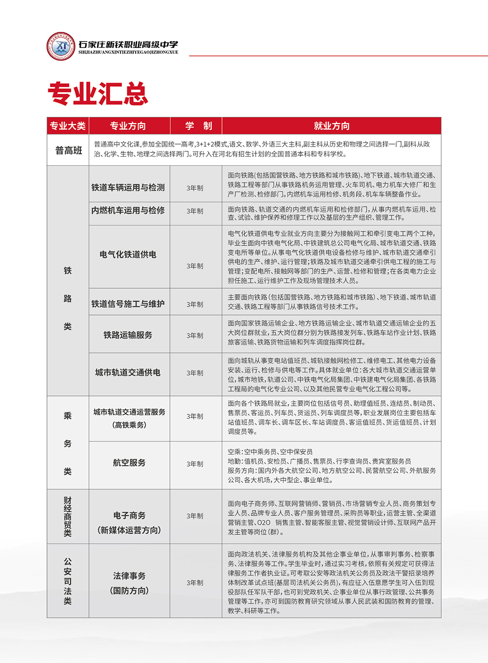 热门专业:铁道运输服务(高铁乘务)、轨道交通运营管理、铁路车辆、内燃机车(火车司机)、电气化、工程测量、航空服务、新能源汽车维修、铁道信号、电子商务(新媒体运营)、机电技术、无人机、工业机器人、艺术设计、运动训练、绘画、卫生信息管理(护理、口腔)等20多个热门专业供你选择学习,毕业发各类相关证件和毕业证书,学校推荐学生就业,签就业协议。