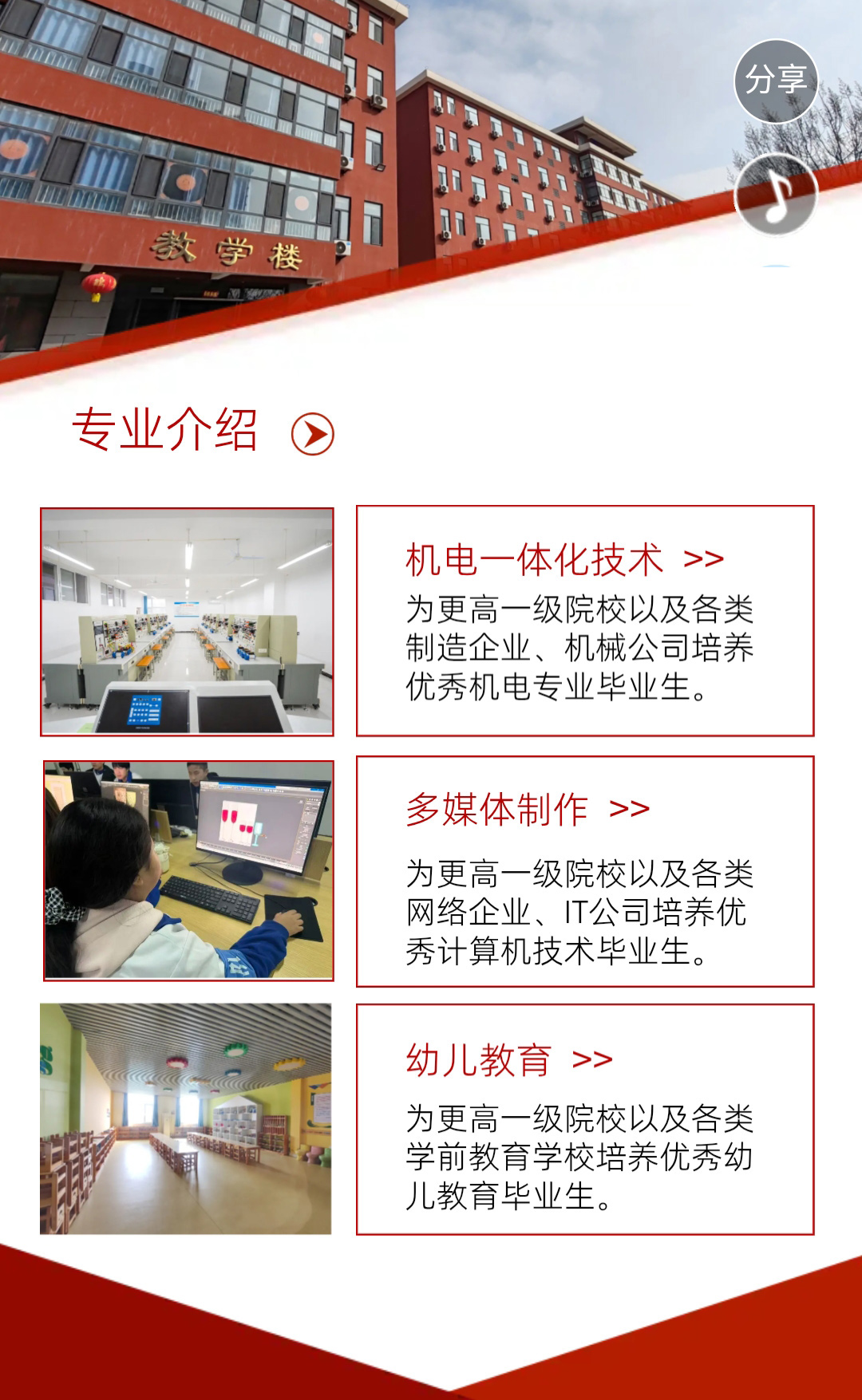 邯郸市华夏技工学校是经河北省人力资源和社会保障厅批准设立的全日制技工学校,毕业颁发双证一毕业证书与技能等级证书;开设机电一体化技术、多媒体制作、幼儿教育、舞蹈表演、美术绘画五大特色专业。