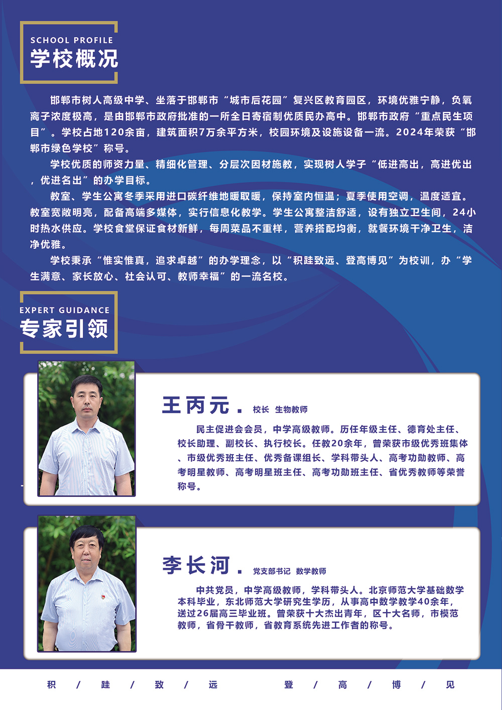 邯郸市树人中学是由“邯郸市人民政府”批准、斥资4.2亿元匠心打造的一所现代化全日寄宿制优质民办高中,坐落于风景秀丽的复兴区经济开发区教育园区。学校占地120余亩,建筑面积7万余平方米,设施设备一流,师资力量雄厚,校园环境优雅,周边公园林立,交通便捷,适宜学习和生活。
