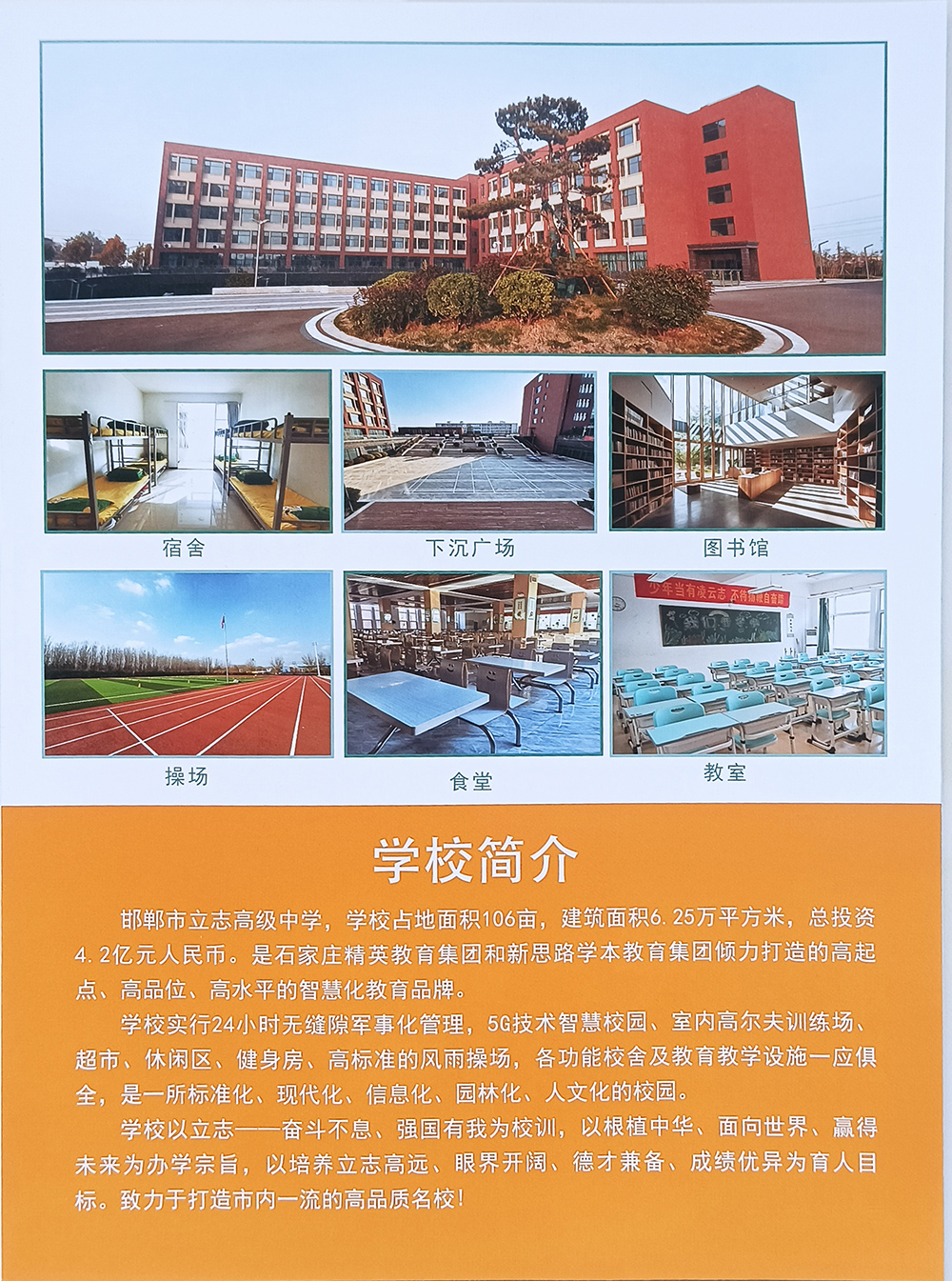 招生简章,邯郸立志高中学校文化课开设班型:985立志班,鸿志班,精英班,实验班。